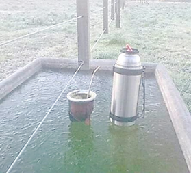 Perceba que a água que o boi realmente bebe está na superfície — cerca de 30 cm de diâmetro por 10 cm de profundidade.
